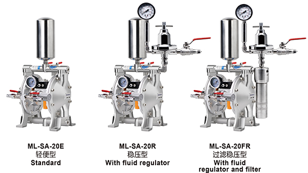 以明丽的气动隔膜泵为例,材质分为铝合金、不锈钢、尼龙三种;按功能分为轻便型、稳压型、稳压过滤型;按大小分为10/15/20。气动隔膜泵更适合喷涂量大的流水线作业,中途不用停歇。