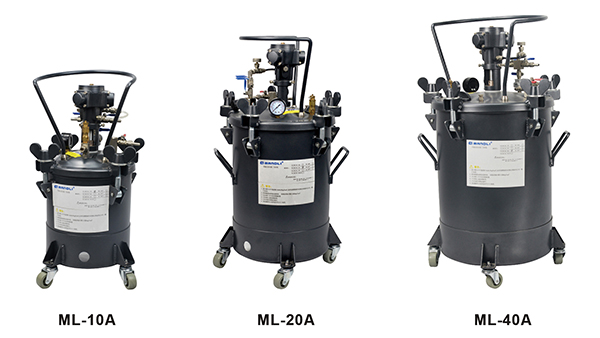 明丽气动压力桶,材质分为铝合金、不锈钢两种,按功能有带搅拌和不带搅拌两种,常用的容量有2L/10L/20L/40L四种,其他大小也可以定制。气动压力桶有容量的限制,更适合喷涂量不大的作业环境。