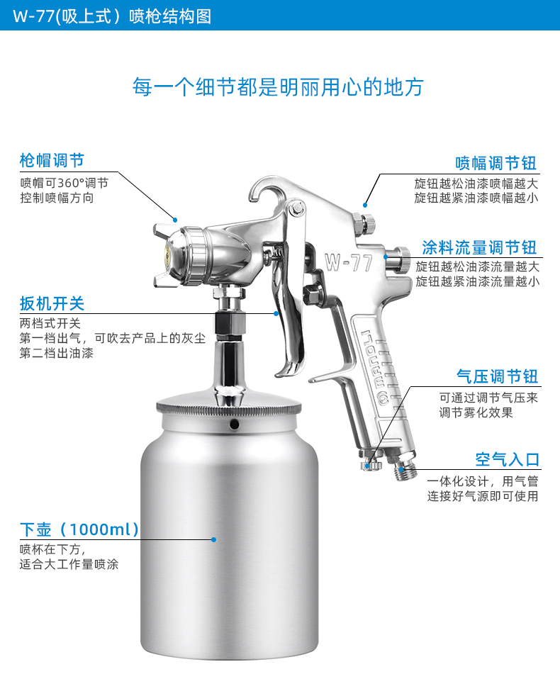 【优点】:喷嘴和顶针经过特殊处理,硬度高,耐磨损,可延长使用寿命。口径大,流量大,喷幅宽,适合喷膜厚、面积大的产品底漆。