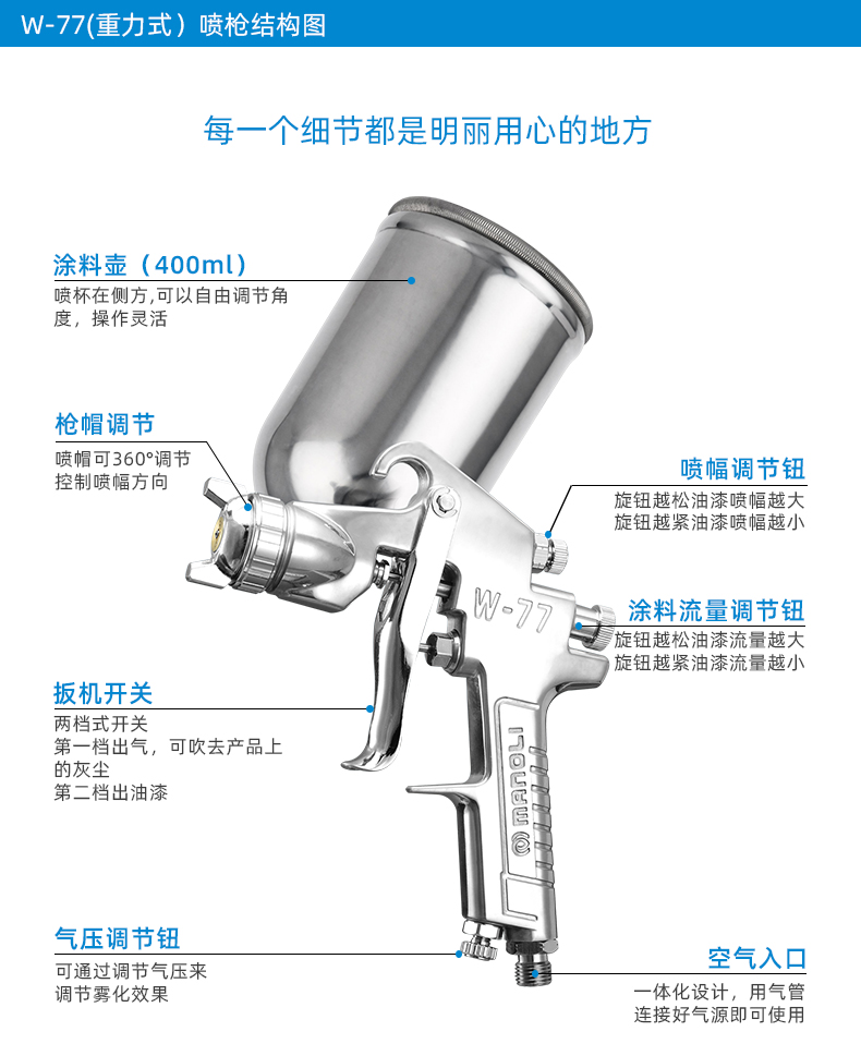 【优点】:喷嘴和顶针经过特殊处理,硬度高,耐磨损,可延长使用寿命。口径大,流量大,喷幅宽,适合喷膜厚、面积大的产品底漆。