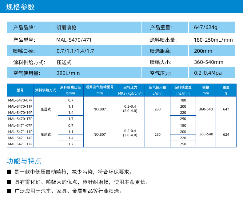 【优点】:不锈钢材质 ,耐氧化,防生锈,使用寿命更长,为水性漆专用喷枪。低压环保,具有雾化好、喷幅大、涂料附着率高的优点。