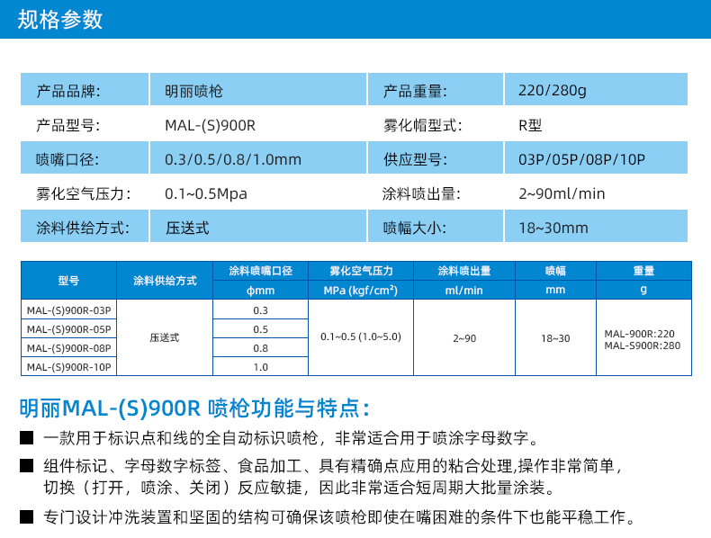【优点】:MAL-(S)900R是一款用于标识点和线的全自动标识喷枪,雾化细腻,边缘齐整。