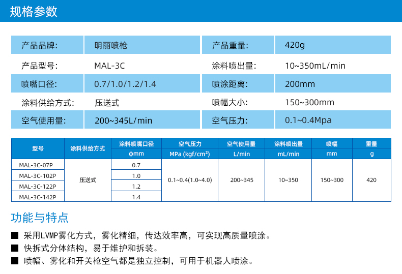 【优点】:采用LVMP雾化方式,雾化精细,传达效率高,可实现高质量喷涂。 快拆式分体结构,易于维护和拆装。 喷幅、雾化和喷枪开关都可以独立外控,适合机器人喷涂。