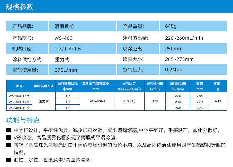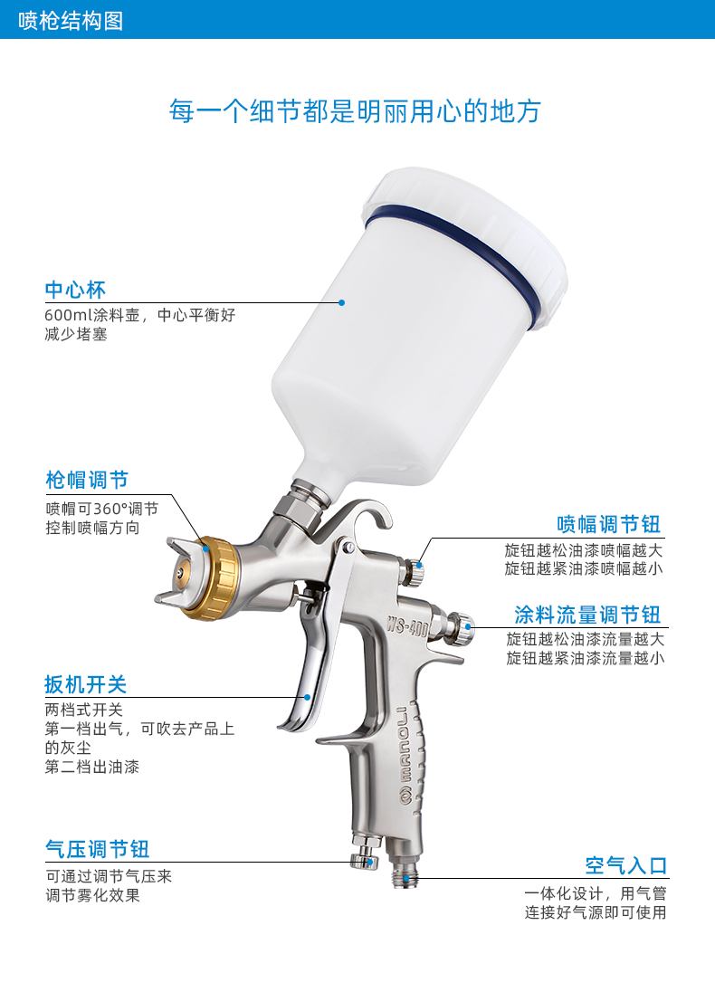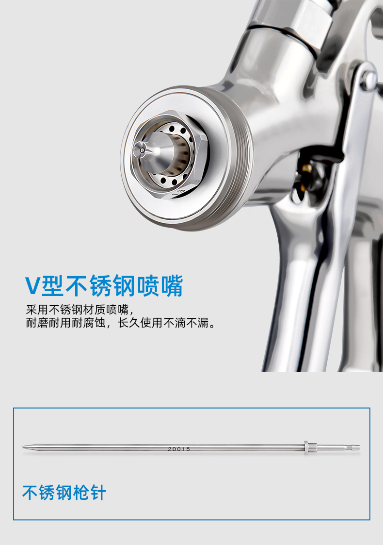 【优点】:中心杯设计,平稳性优异,减少喷嘴堵塞,手感轻巧,雾化分散好; V形喷嘴,雾化更加细腻平滑。