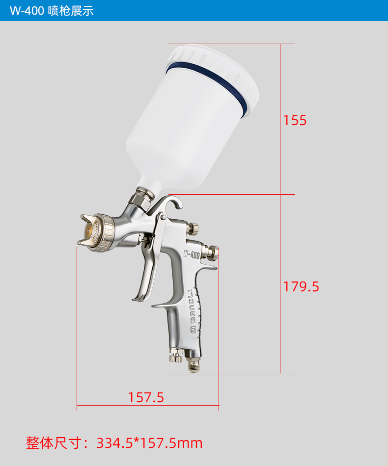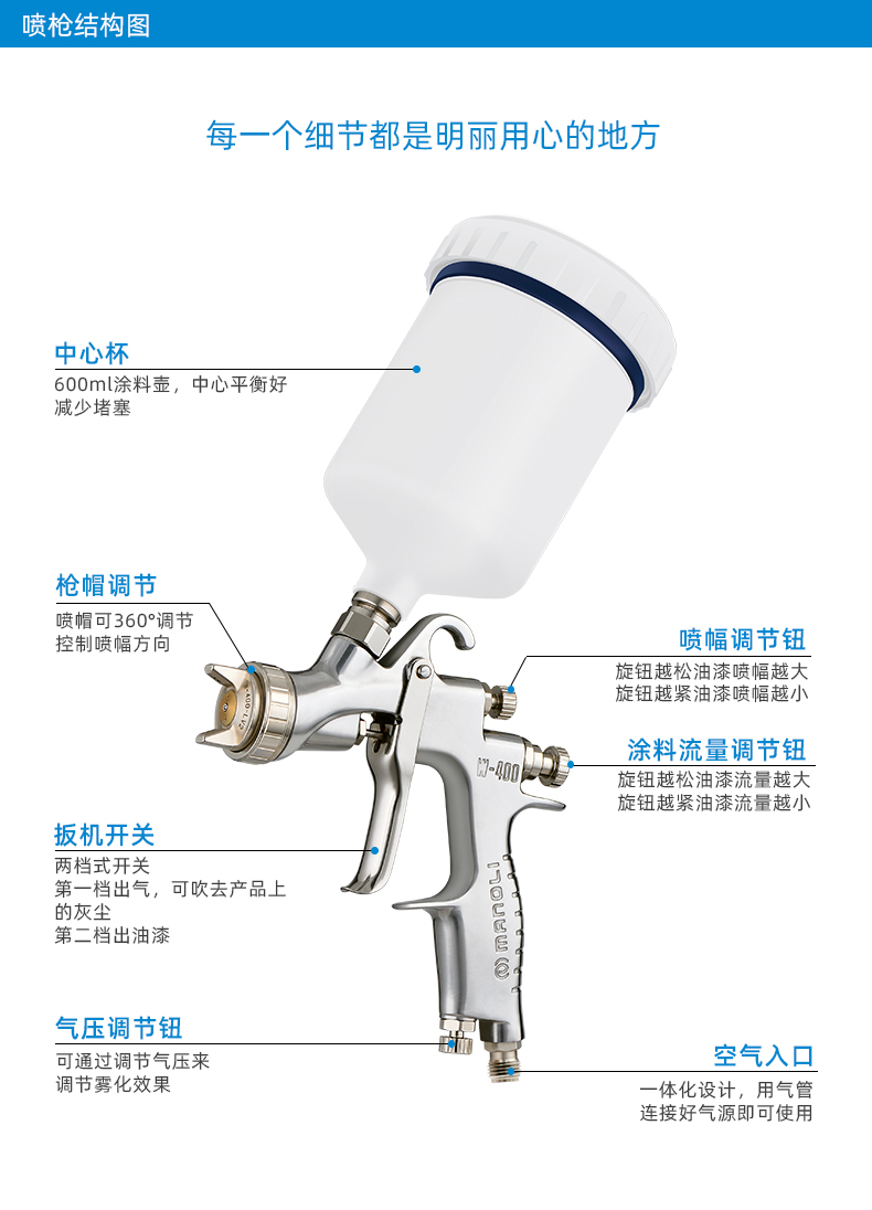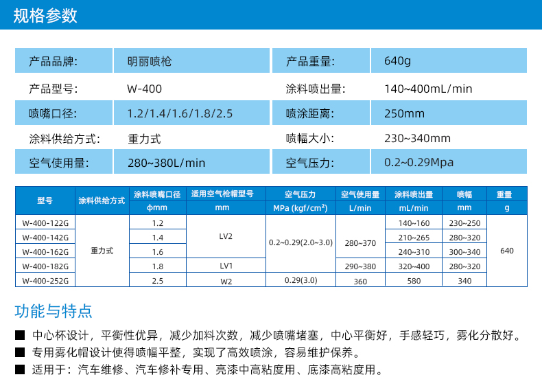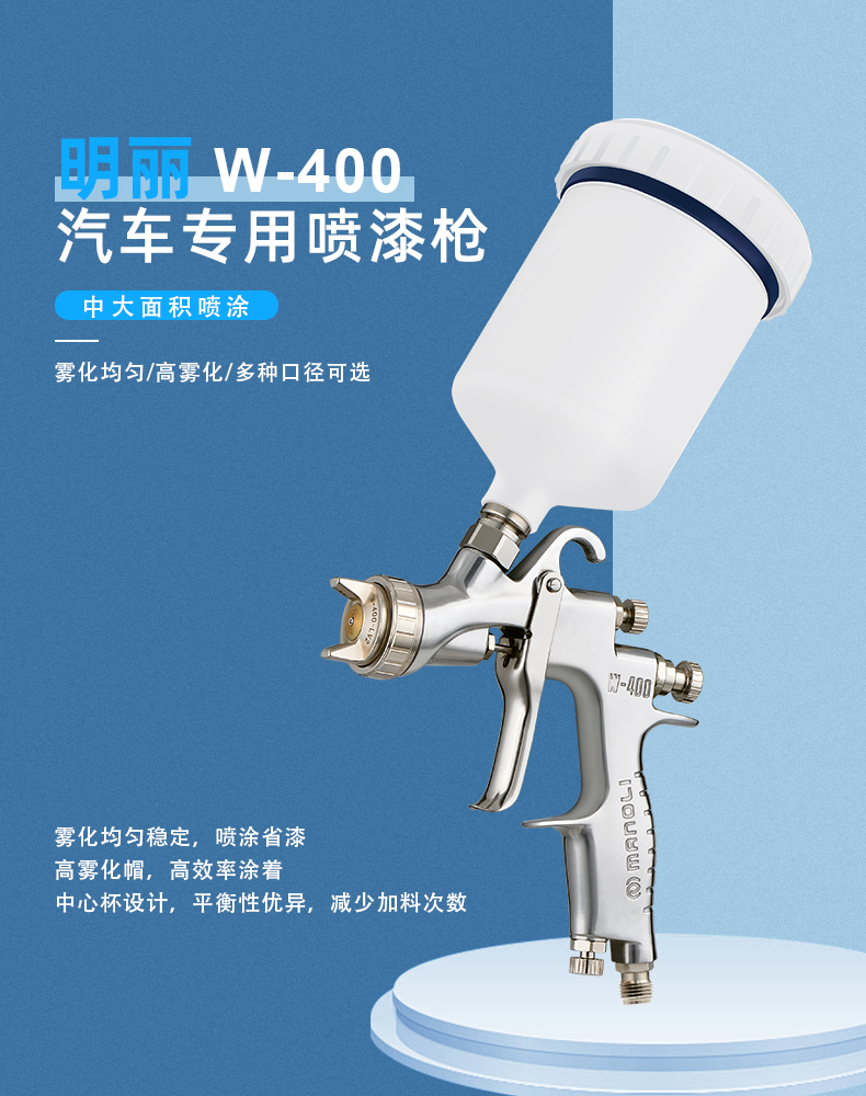 【优点】:中大面积喷涂,中压雾化,雾化均匀稳定,喷涂省漆; 中心杯设计,平稳性优异,减少加料次数。